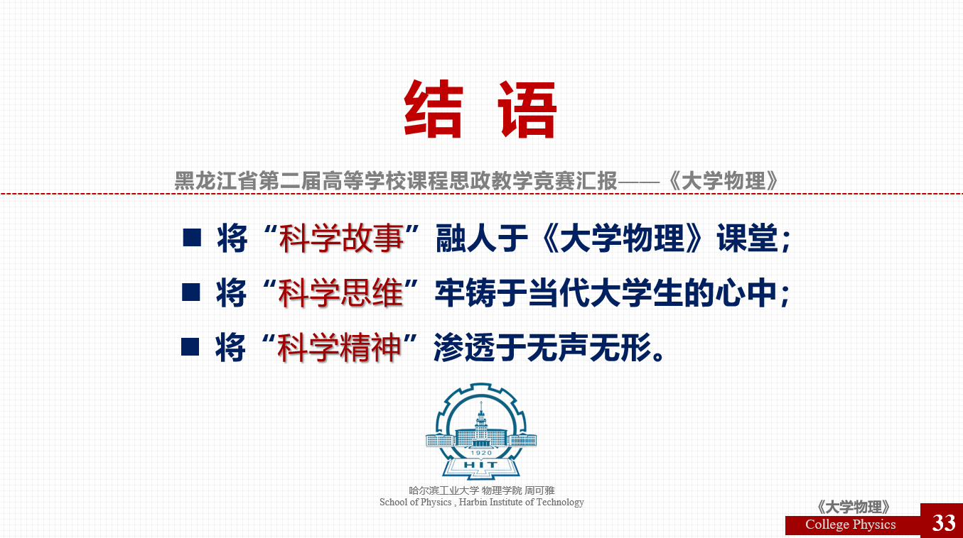 2023年4月27日黑龙江省教育厅发布《黑龙江省教育厅关于公布黑龙江省第二届高等学校课程思政教学竞赛获奖结果的通知》,我院大学物理教研中心周可雅副教授获得第二届黑龙江省高校课程思政教学竞赛总决赛(本科教育赛道)理科组第1名、特等奖。
